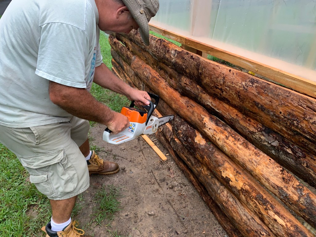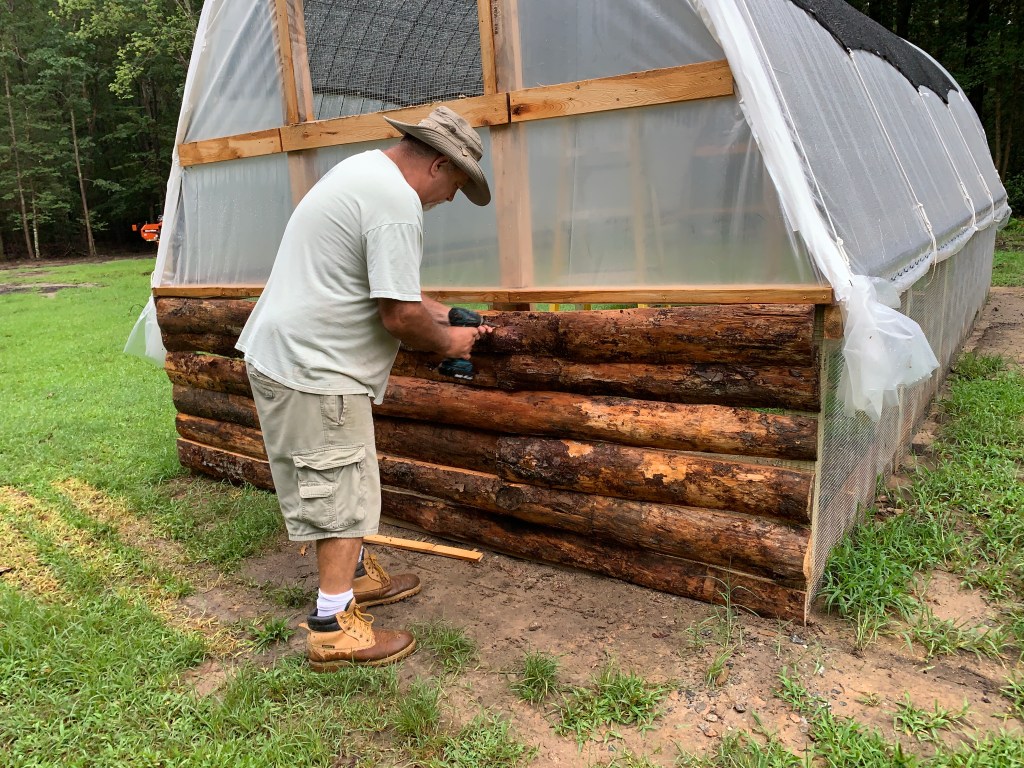 Between rain showers, Dick and I worked on finishing one of the end caps of the hoop house. Flitches, wood planks with bark, cover the bottom half of the back end cap. A creative touch used for the raised beds and compost bin.