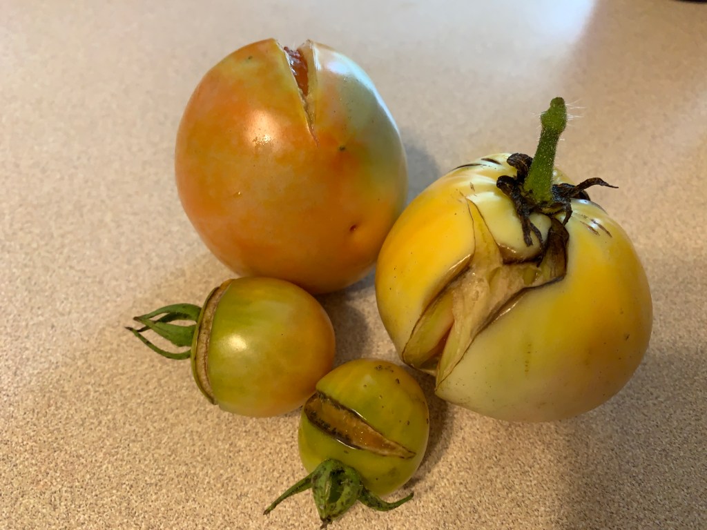 I didn’t hear the storm last night, but it must have poured. The rain washed out the gravel between the garage and the blueberries. It’s also caused several tomatoes to split.