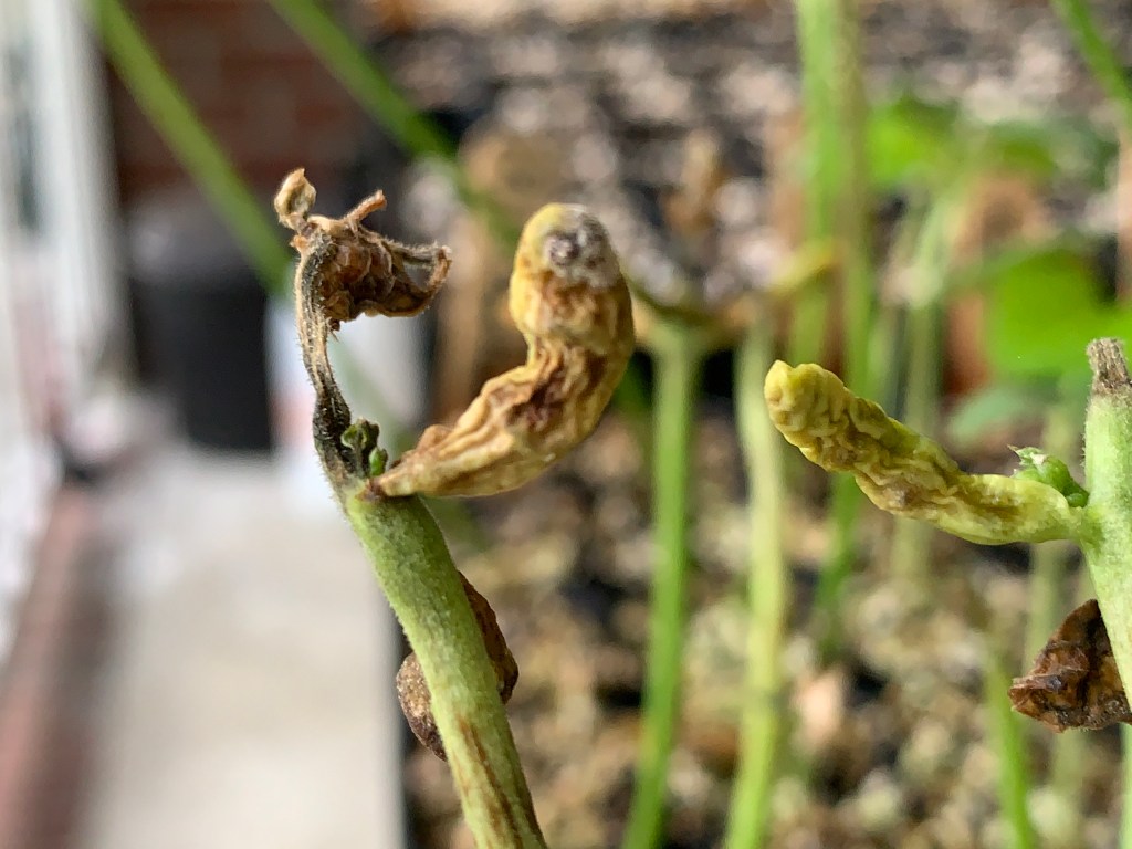 The seed trays were left under the protection of the porch during the heavy rains for several days. The beans turned spindly, like indoor plants without enough light. Their leaves appeared burnt, or dried.