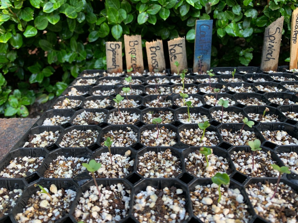 Seeds are plunged into our best seed-starter mix as soon as practical (or sooner). The seed trays are watched anxiously for any sign of germination. Then it’s under the grow lights.